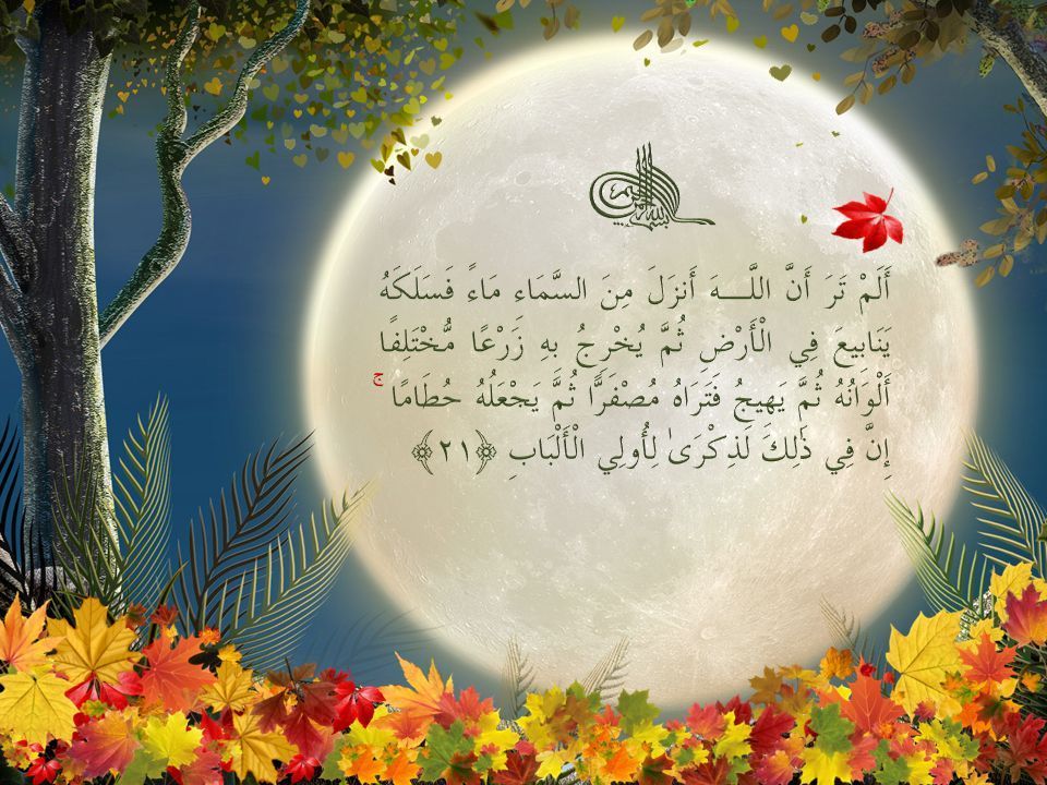 مگر ندیدهاى که خدا از آسمان آب باران نازل گردانید و آن را به چشمههایى که در زمین است روان ساخت، آن گاه به وسیله آن گیاهان رنگارنگ برویاند باز رو به خزان آرد و بنگری که زرد شود سپس خاشاکش مىگرداند؟ در این مثال تذکّری برای خردمندان است.